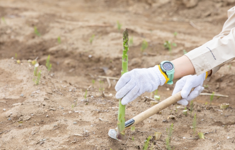 肥沃な大地で育ったアスパラはスーパーなどでは見たことないくらい大きい!カマでサクっと切ると水しぶきが飛ぶくらいにみずみずしいです。